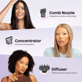 - Precision Styling Attachments Nozzle, diffuser, and comb for all hair types